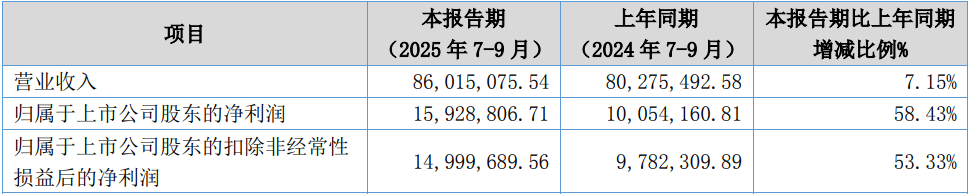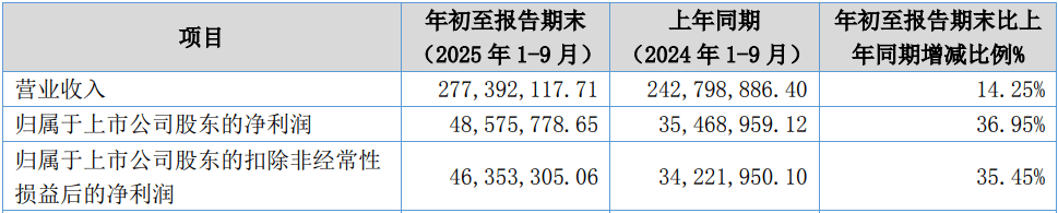 2025年10月29日,奥美森智能配备股份无限公司(证券简称:奥美森;证券代码:920080。BJ)发布三季报通知布告,演讲内显示公司前三季度收入利润双增加,收入同比增加14。25%,扣非归母净利润同比增加35。45%。