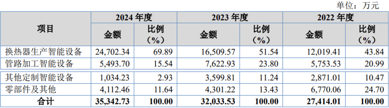 奥美森做为近期登岸北交所的智能配备企业,自2003年成立以来,一直专注于热互换器及管加工配备的研发取制制,逐渐建立起以成形工艺、工件流转、加工工艺取智能节制等为焦点的手艺系统,正在缩管、弯管、成型等环节工艺环节堆集了深挚的手艺底蕴。凭仗结实的手艺堆集取持续的产物立异,公司已将其产物成功拓展至空调、环保、风电、正在空互换热器智能配备这一劣势细分市场,奥美森市场拥有率持续提拔,从2022年的8。33%增加至2024年的12。61%,稳居国内行业前列,客户笼盖格力电器、美的集团、大金、松劣等国表里支流空调制制企业。近年来,公司积极把握“大规模设备更新”政策机缘,正在巩固家电根基盘的同时,加快向新能源范畴拓展。目前,奥美森已成功进入比亚迪、明阳智能等头部客户的供应链,供给锂电池热压整形设备、风电叶片铣削机等定制化智能配备,实现从保守家电范畴向新能源高端配备的主要冲破。正在市场结构方面,奥美森持续推进国际化计谋,产物已出口至伊朗、印度、泰国等24个“一带一”沿线多个国度和地域,逐渐建立起国表里市场协同成长的“双轮回”营业款式。公司是一家做从动化设备的企业,次要产物包罗换热器出产和管加工所需的智能出产用设备,终端使用范畴次要为电器、环保、风电和锂电新能源等。