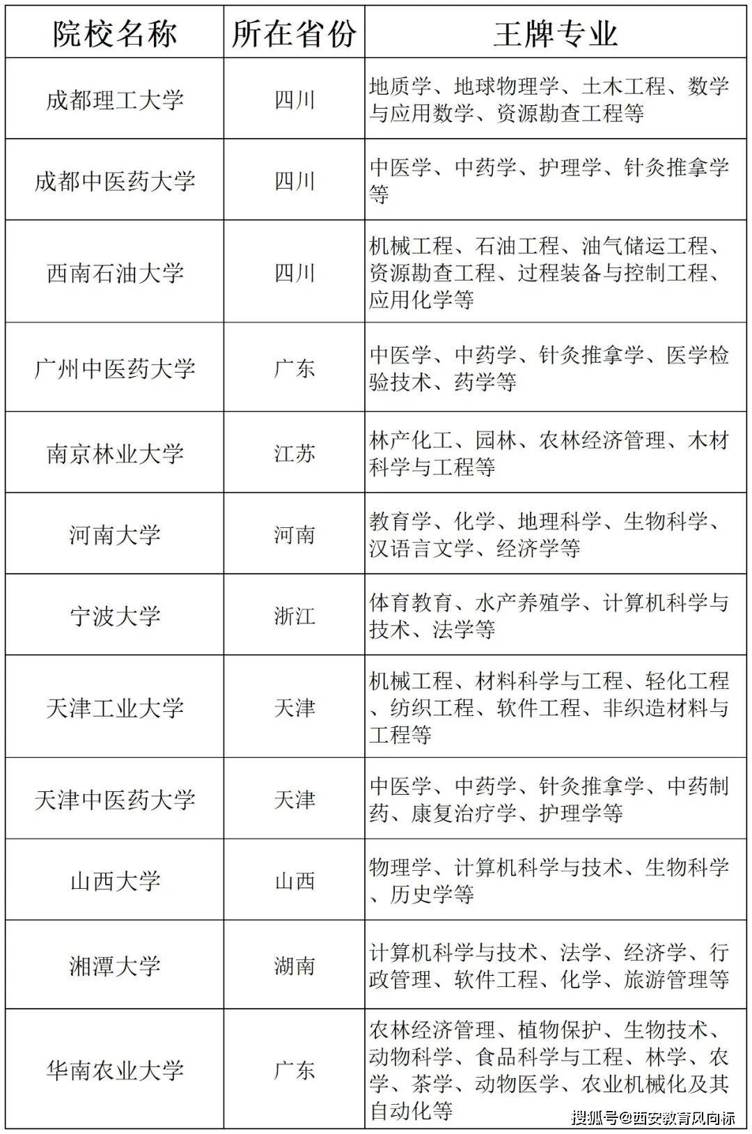 成都理工大学、成都西医药大学、西南石油大学、广州西医药大学、河南大学、南京林业大学、宁波大学、天津工业大学、天津西医药大学、山西大学、湘潭大学、华南农业大学