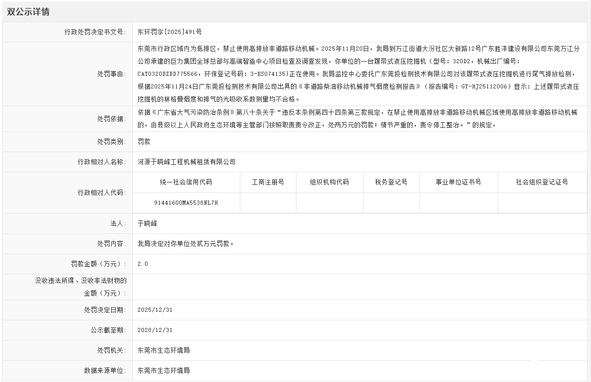 日前,东莞市生态局正在信用中国(广东·东莞)传递称,河源于晓峰工程机械租赁无限公司正在东莞万江利用高排放非道挪动机械,被罚2万元。据领会,从2025年11月1日起,东莞全市范畴内全面利用高排放非道挪动机械。