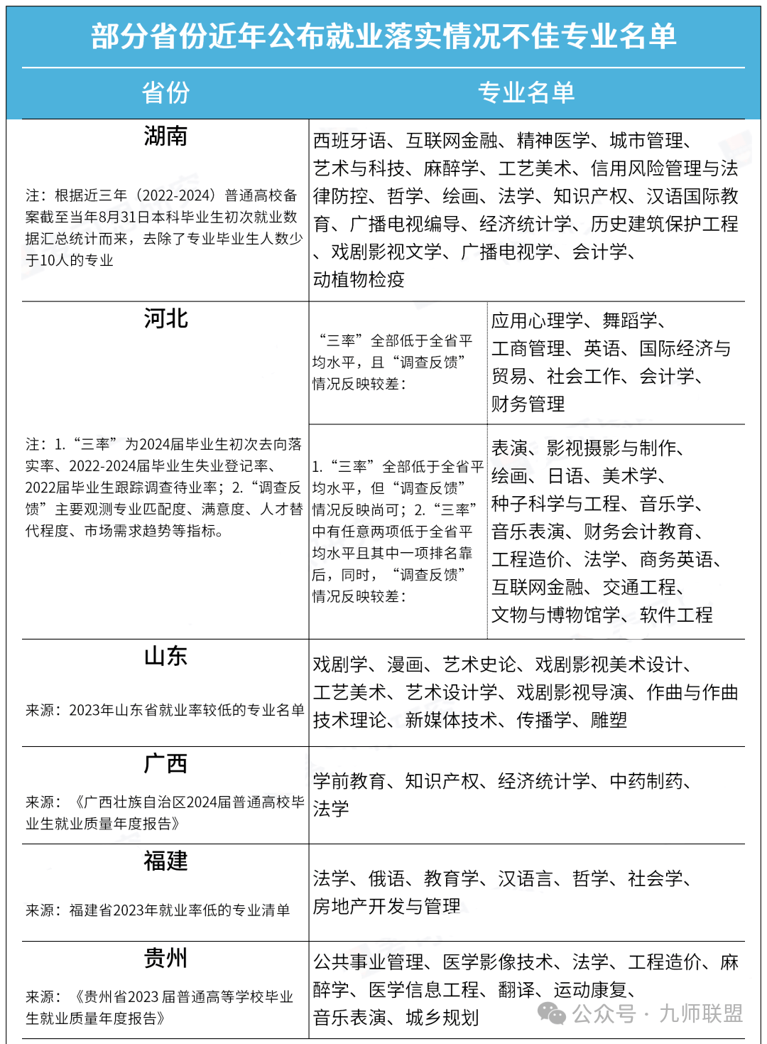 早正在2024年发布的《地方 国务院关于实施就业优先计谋推进高质量充实就业的看法》中就已要求,“迁就业情况做为办学资本设置装备摆设、教育质量评估、招生打算放置的主要根据,对就业质量不高的专业实行红黄牌提醒轨制”。《福建省委 福建省人平易近关于全方位推进高质量充实就业的实施看法》提到,对就业质量不高的专业赐与红黄牌提醒,调减或遏制招生。教育厅等5部分出台的《关于推进师范教育高质量成长的若干办法》中也提到,将成立师范类专业红黄牌轨制,对就业率较低或专业认证一级监测不达标的,实施专业预警和退出机制。江西省《通俗高档学校本科专业布局优化调整指点法子(试行)》中明白,结业去向落实率低于50%的专业点,将被亮黄牌,扣减招生打算;持续2年低于50%的专业点,责令其暂停招生。四川省《关于深化高档学校“就业—招生—培育”联动机制的指点看法》提出,对结业去向落实率持续2年低于50%的专业点实行黄牌提醒,持续3年低于50%的专业点实行红牌提醒。若专业持续两年结业去向落实率位居末位,就要面对减招、停招的风险。对高校而言,招生打算取就业数据间接挂钩,将倒逼其专业设置回归社会需求取培育质量本身。从地方顶层设想四处所量化细则,从数据逃踪到招生联动,一套“就业导向、动态调整”的专业管理闭环已逐渐成立。跟着各省按期发布当地化预警名单渐成常态,高校的专业布局优化将步入愈加通明、更具束缚力的新阶段。前往搜狐,查看更多。扫二维码用手机看